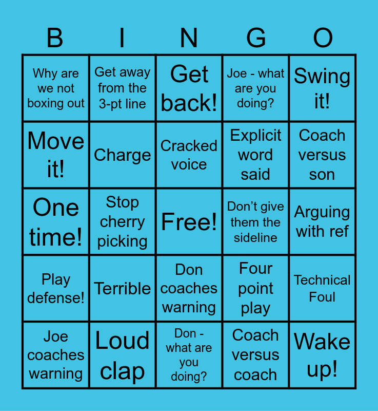 This bingo card has a free space and 24 words: Terrible, Loud clap, Cracked voice, Joe coaches warning, Swing it!, Why are we not boxing out, Move it!, Get away from the 3-pt line, Don’t give them the sideline, Don coaches warning, Explicit word said, One time!, Four point play, Technical Foul, Charge, Coach versus coach, Arguing with ref, Get back!, Coach versus son, Stop cherry picking, Wake up!, Play defense!, Joe - what are you doing? and Don - what are you doing?.