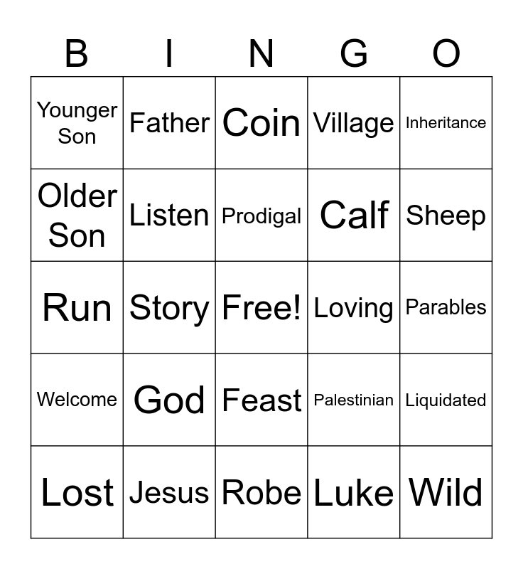 This bingo card has a free space and 24 words: God, Jesus, Prodigal, Lost, Inheritance, Younger Son, Older Son, Father, Loving, Feast, Calf, Run, Palestinian, Liquidated, Listen, Luke, Parables, Coin, Sheep, Story, Wild, Welcome, Village and Robe.