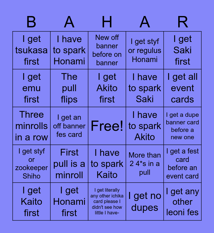 This bingo card has a free space and 24 words: First pull is a minroll, I get Honami first, I get Akito first, I get Kaito first, I get Saki first, I get tsukasa first, I get emu first, I have to spark Honami, I have to spark Akito, I have to spark Kaito, I have to spark Saki, Three minrolls in a row, More than 2 4*s in a pull, I get a fest card before an event card, The pull flips, I get no dupes, I get a dupe banner card before a new one, New off banner before on banner, I get all event cards, I get an off banner fes card, I get any other leoni fes, I get styf or zookeeper Shiho, I get styf or regulus Honami and I get literally any other ichika card please I didn't see how little I have-.