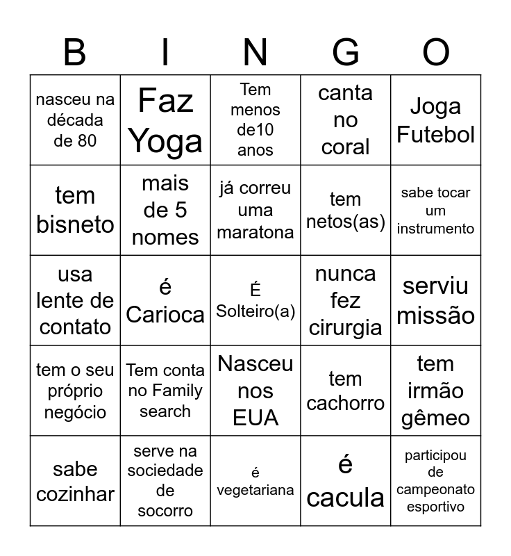 This bingo card has 70 words: morou fora do país, é Carioca, tem 3 ou mais filhos, fala mais de um idioma, serviu missão, Chega cedo na Igreja, Faz Yoga, é filho (a)mais velho, tem netos(as), serve na primária, morou a vida toda em Utah, é Paulista, Tem menos de10 anos, canta no coral, Engraxa seus sapatos, tem o seu próprio negócio, serve na sociedade de socorro, já correu uma maratona, sabe assar pao, sabe tocar um instrumento, sabe cozinhar, está usando rosa, É Solteiro(a), tem cachorro, tem gato, casado (a)mas nao tem filhos, tem pos graduacao, não sabe nadar, nunca fez cirurgia, Nasceu depois de 2017, nasceu na década de 80, é casado(a) mais de 10 anos, é casada a menos de 10 anos, sabe costurar, Fez o Pathway connect, é conversa, nasceu na igreja, Toca piano, é cacula, Joga Futebol, é do Sul do Brasil, Tem conta no Family search, Nasceu nos EUA, Nasceu de parto normal, nunca pintou o cabelo, tem bisneto, leu 5 livros esse ano, já bateu o carro, Casou em 1 mes, tem mais de 1,75m, número de sapato 34, faz aniversário no mesmo mês que voce, é vegetariana, Não é de efraim e manassés, tem irmão gêmeo, nasceu na década de 90, mais de 5 nomes, já viu alguém famoso, já ficou presa no elevador, participou de campeonato esportivo, usa lente de contato, já usou aparelho de dente, gosta de matemática, consegue lamber o nariz, Tem 14 anos, já quebrou um osso, é canhoto, nao tem instagram, já serviu missão and acorda antes das 6am.