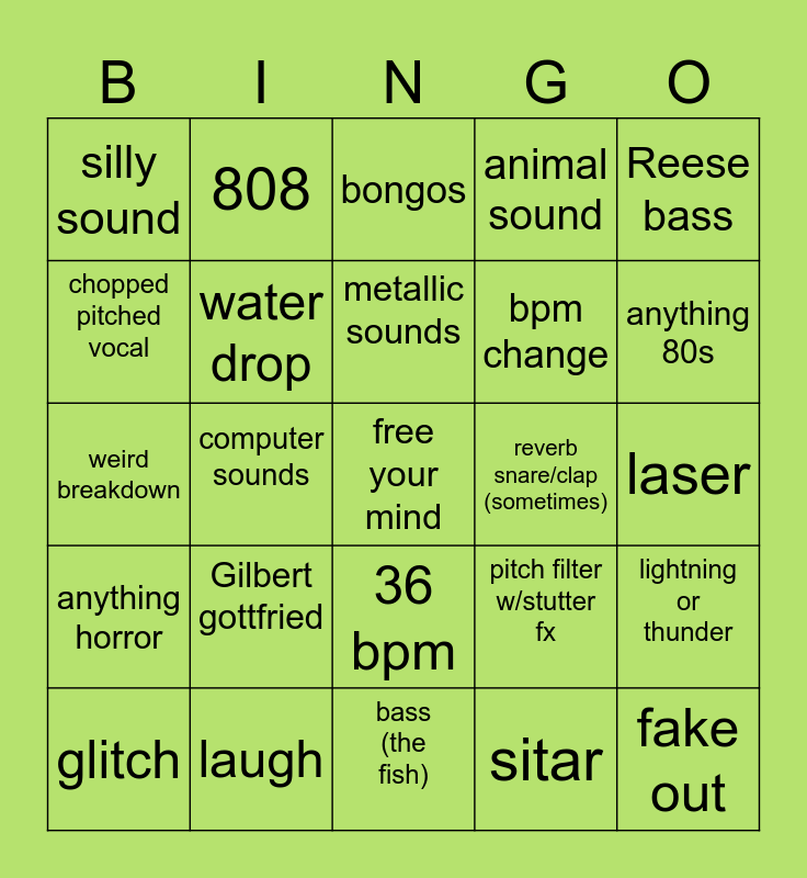 This bingo card has a free space and 24 words: Gilbert gottfried, laugh, metallic sounds, glitch, Reese bass, silly sound, chopped pitched vocal, 808, reverb snare/clap (sometimes), 36 bpm, bpm change, weird breakdown, pitch filter w/stutter fx, lightning or thunder, water drop, sitar, laser, bongos, anything 80s, computer sounds, fake out, anything horror, animal sound and bass (the fish).