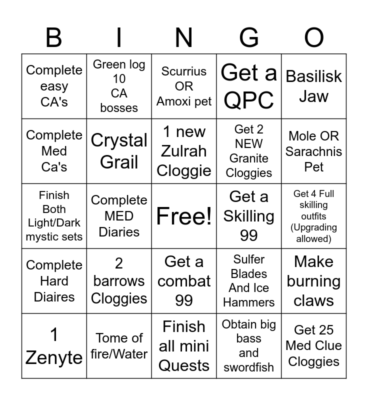 This bingo card has a free space and 24 words: 2 barrows Cloggies, Tome of fire/Water, 1 new Zulrah Cloggie, 1 Zenyte, Basilisk Jaw, Complete easy CA's, Complete Med Ca's, Green log 10 CA bosses, Get a Skilling 99, Get a combat 99, Get 2 NEW Granite Cloggies, Finish Both Light/Dark mystic sets, Sulfer Blades And Ice Hammers, Make burning claws, Crystal Grail, Obtain big bass and swordfish, Get 4 Full skilling outfits (Upgrading allowed), Scurrius OR Amoxi pet, Mole OR Sarachnis Pet, Complete MED Diaries, Get 25 Med Clue Cloggies, Complete Hard Diaires, Get a QPC and Finish all mini Quests.