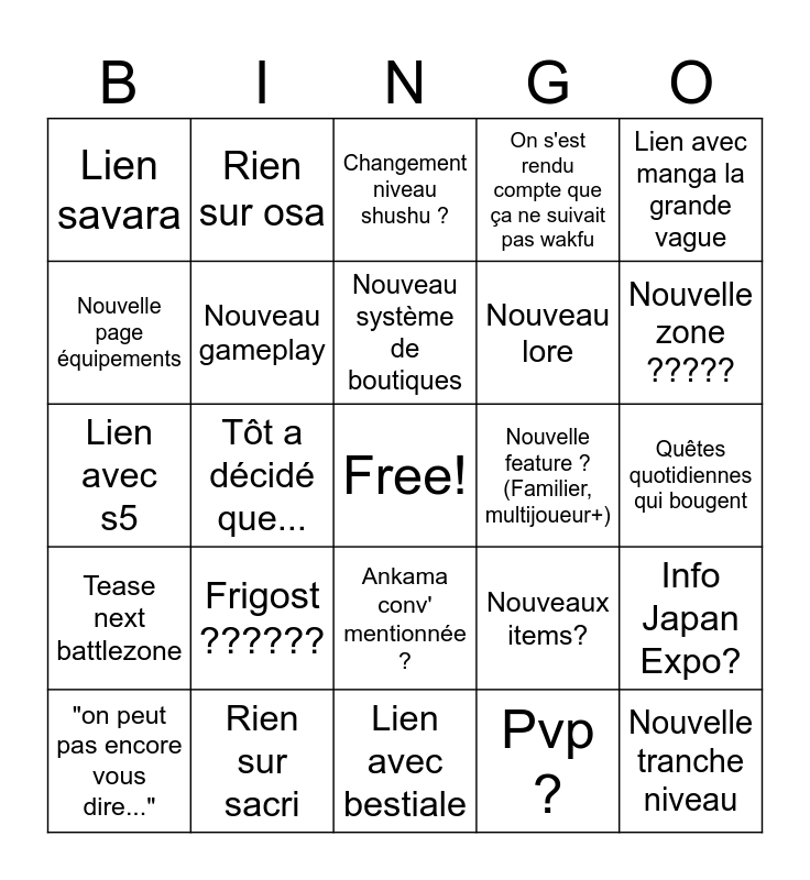 This bingo card has a free space and 24 words: Frigost ??????, Rien sur sacri, Nouveau système de boutiques, "on peut pas encore vous dire...", Lien avec manga la grande vague, Lien savara, Nouvelle page équipements, Rien sur osa, Nouvelle feature ? (Familier, multijoueur+), Ankama conv' mentionnée ?, Nouveau lore, Lien avec s5, Nouveaux items?, Info Japan Expo?, Nouveau gameplay, Pvp ?, Quêtes quotidiennes qui bougent, Changement niveau shushu ?, Nouvelle zone ?????, Tôt a décidé que..., Nouvelle tranche niveau, Tease next battlezone, On s'est rendu compte que ça ne suivait pas wakfu and Lien avec bestiale.