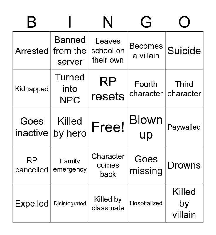 This bingo card has a free space and 24 words: Family emergency, Disintegrated, RP resets, Expelled, Suicide, Arrested, Kidnapped, Banned from the server, Blown up, Character comes back, Fourth character, Goes inactive, Goes missing, Drowns, Turned into NPC, Hospitalized, Paywalled, Leaves school on their own, Third character, Killed by hero, Killed by villain, RP cancelled, Becomes a villain and Killed by classmate.
