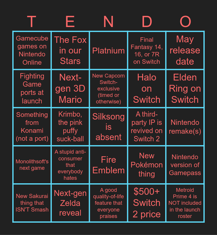 This bingo card has a free space and 24 words: A stupid anti-consumer that everybody hates, Next-gen Zelda reveal, New Capcom Switch-exclusive (timed or otherwise), New Sakurai thing that ISN'T Smash, May release date, Gamecube games on Nintendo Online, Fighting Game ports at launch, The Fox in our Stars, A third-party IP is revived on Switch 2, Fire Emblem, Halo on Switch, Something from Konami (not a port), New Pokémon thing, Nintendo version of Gamepass, Next-gen 3D Mario, $500+ Switch 2 price, Nintendo remake(s), Platnium, Elden Ring on Switch, Krimbo, the pink puffy suck-ball, Metroid Prime 4 is NOT included in the launch roster, Monolithsoft's next game, Final Fantasy 14, 16, or 7R on Switch and A good quality-of-life feature that everyone praises.