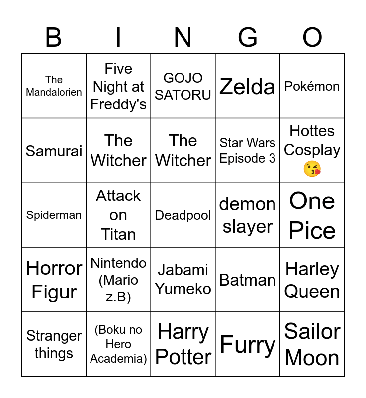This bingo card has a free space and 24 words: Nintendo (Mario z.B), (Boku no Hero Academia), The Witcher, Stranger things, Pokémon, The Mandalorien, Samurai, Five Night at Freddy's, demon slayer, Jabami Yumeko, Star Wars Episode 3, Spiderman, Batman, Harley Queen, The Witcher, Furry, One Pice, GOJO SATORU, Hottes Cosplay 😘, Attack on Titan, Sailor Moon, Horror Figur, Zelda and Harry Potter.