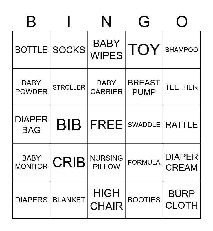 This bingo card has a free space and 29 words: DIAPERS, ONESIE, BIB, PACIFIER, BOTTLE, BABY WIPES, STROLLER, CRIB, SWADDLE, BLANKET, RATTLE, BURP CLOTH, HIGH CHAIR, BOOTIES, TEETHER, LOTION, NURSING PILLOW, BABY MONITOR, SHAMPOO, DIAPER BAG, FORMULA, WASH CLOTH, BREAST PUMP, BABY POWDER, TOY, SOCKS, DIAPER CREAM, BABY CARRIER and OUTFIT.