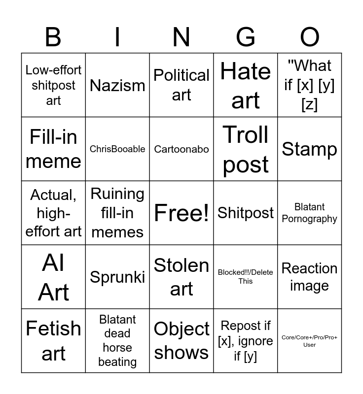 This bingo card has a free space and 24 words: Sprunki, Blatant dead horse beating, Cartoonabo, Fetish art, ''What if [x] [y] [z], Low-effort shitpost art, Fill-in meme, Nazism, Shitpost, Stolen art, Troll post, Actual, high-effort art, Blocked!!/Delete This, Reaction image, ChrisBooable, Repost if [x], ignore if [y], Blatant Pornography, Political art, Stamp, Ruining fill-in memes, Core/Core+/Pro/Pro+ User, AI Art, Hate art and Object shows.