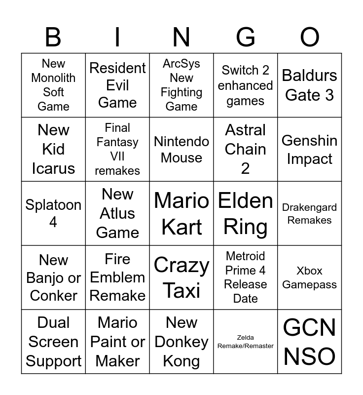 This bingo card has a free space and 24 words: Dual Screen Support, Fire Emblem Remake, Nintendo Mouse, Zelda Remake/Remaster, Baldurs Gate 3, New Monolith Soft Game, Resident Evil Game, ArcSys New Fighting Game, Elden Ring, Drakengard Remakes, Splatoon 4, Final Fantasy VII remakes, Metroid Prime 4 Release Date, Xbox Gamepass, New Kid Icarus, Mario Paint or Maker, New Donkey Kong, Switch 2 enhanced games, Genshin Impact, New Banjo or Conker, New Atlus Game, Crazy Taxi, Astral Chain 2 and GCN NSO.