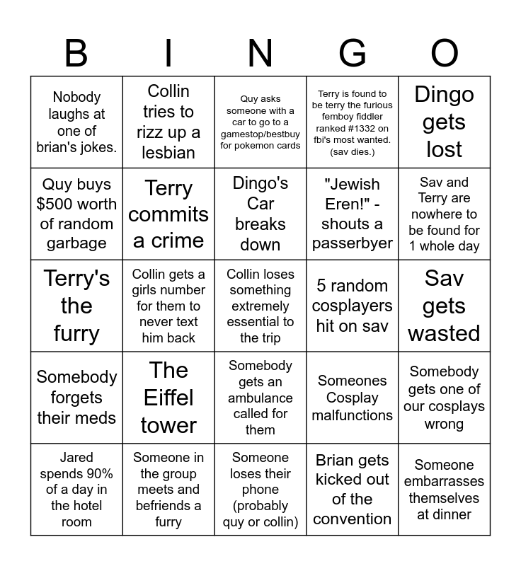 This bingo card has a free space and 24 words: The Eiffel tower, Someone in the group meets and befriends a furry, Dingo's Car breaks down, Jared spends 90% of a day in the hotel room, Dingo gets lost, Nobody laughs at one of brian's jokes., Quy buys $500 worth of random garbage, Collin tries to rizz up a lesbian, 5 random cosplayers hit on sav, Somebody gets an ambulance called for them, "Jewish Eren!" -shouts a passerbyer, Terry's the furry, Someones Cosplay malfunctions, Somebody gets one of our cosplays wrong, Terry commits a crime, Brian gets kicked out of the convention, Sav gets wasted, Quy asks someone with a car to go to a gamestop/bestbuy for pokemon cards, Sav and Terry are nowhere to be found for 1 whole day, Collin gets a girls number for them to never text him back, Someone embarrasses themselves at dinner, Somebody forgets their meds, Terry is found to be terry the furious femboy fiddler ranked #1332 on fbi's most wanted. (sav dies.) and Someone loses their phone (probably quy or collin).