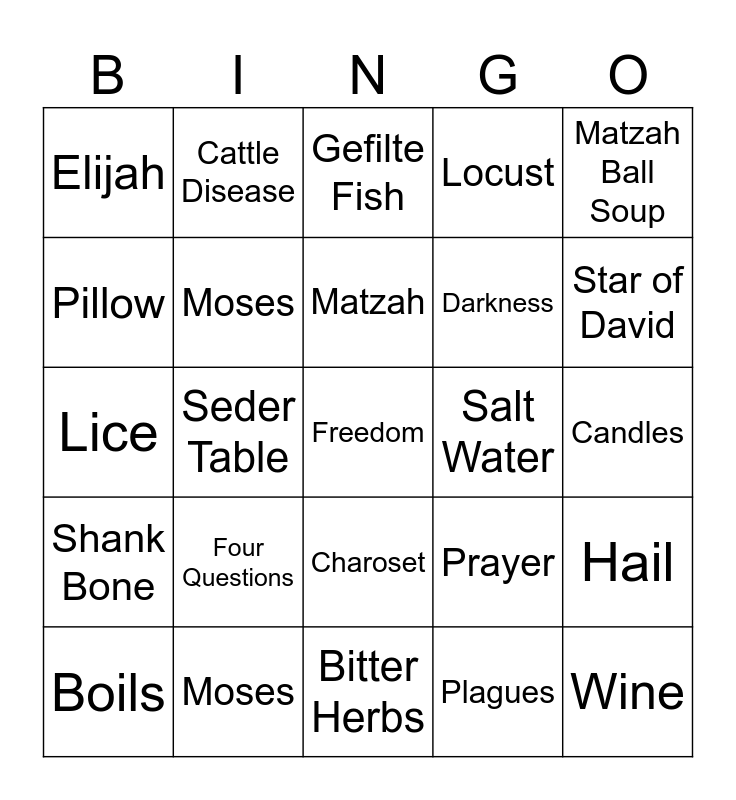 This bingo card has a free space and 39 words: Egypt, Exodus, Egg, Moses, Boils, Charoset, Matzah, Parsley, Matzah Ball Soup, Shank Bone, Seder Table, Locust, Wine, Candles, Salt Water, Four Questions, Afikomen, Elijah, Jerusalem, Prayer, Pillow, Bitter Herbs, Darkness, Star of David, Slavery, Frogs, Dayenu, Seder Plate, Haggadah, Cattle Disease, Wise Son, Recline, Gefilte Fish, Moses, Plagues, Pharoah, Hail, Lice and Passover.