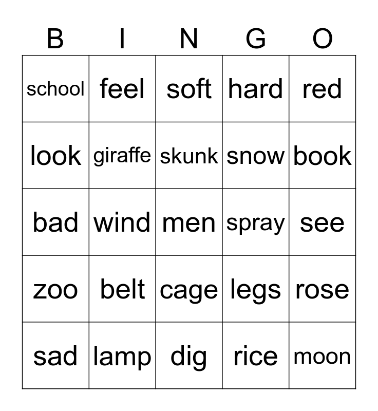 This bingo card has a free space and 24 words: belt, lamp, skunk, sad, red, school, look, feel, spray, cage, snow, bad, legs, rose, giraffe, rice, see, soft, book, wind, moon, zoo, hard and dig.