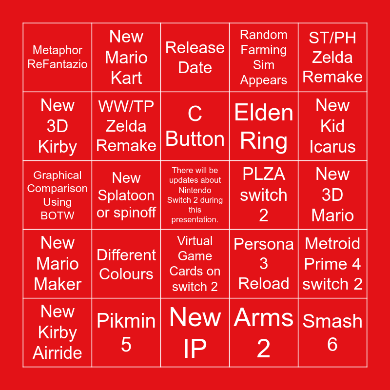 This bingo card has a free space and 24 words: Different Colours, Pikmin 5, C Button, New Kirby Airride, ST/PH Zelda Remake, Metaphor ReFantazio, New 3D Kirby, New Mario Kart, PLZA switch 2, Virtual Game Cards on switch 2, Elden Ring, Graphical Comparison Using BOTW, Persona 3 Reload, Metroid Prime 4 switch 2, WW/TP Zelda Remake, Arms 2, New 3D Mario, Release Date, New Kid Icarus, New Splatoon or spinoff, Smash 6, New Mario Maker, Random Farming Sim Appears and New IP.