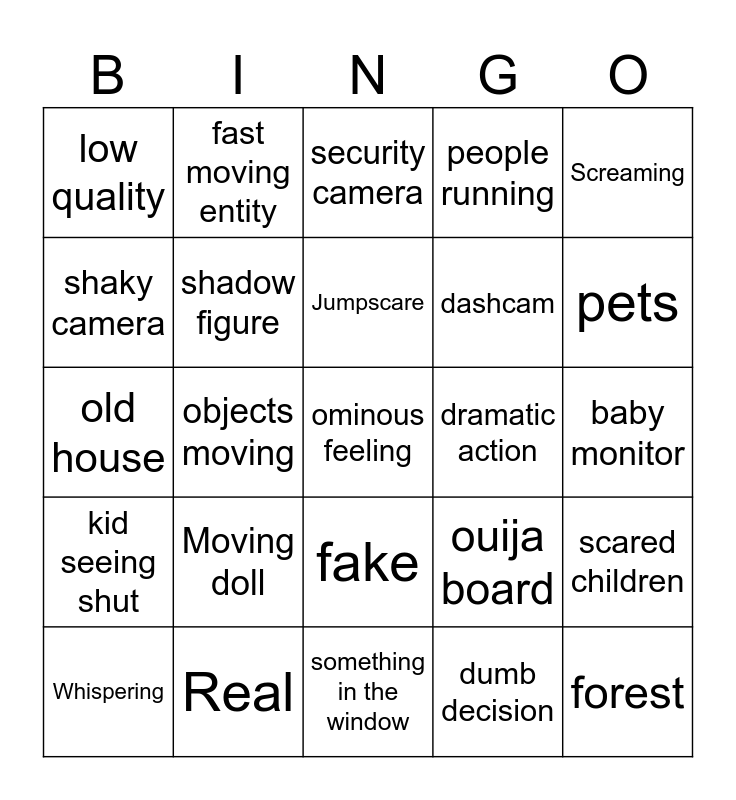 This bingo card has a free space and 24 words: Moving doll, Real, Jumpscare, Whispering, Screaming, low quality, shaky camera, fast moving entity, dramatic action, fake, dashcam, old house, ouija board, scared children, shadow figure, dumb decision, baby monitor, security camera, pets, objects moving, forest, kid seeing shut, people running and something in the window.