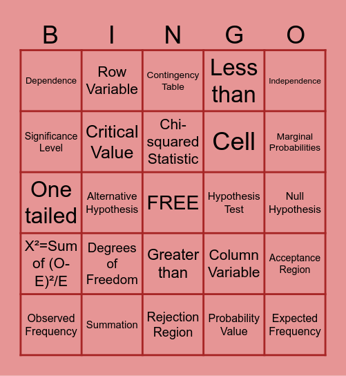 This bingo card has a free space and 24 words: Observed Frequency, Degrees of Freedom, Chi-squared Statistic, Probability Value, Independence, Dependence, Row Variable, Contingency Table, Hypothesis Test, Null Hypothesis, One tailed, Critical Value, Column Variable, Acceptance Region, Significance Level, Summation, Rejection Region, Less than, Marginal Probabilities, X²=Sum of (O-E)²/E, Alternative Hypothesis, Greater than, Cell and Expected Frequency.