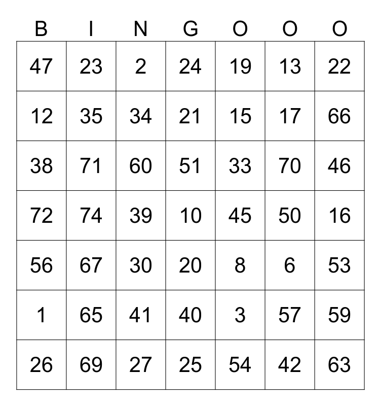 This bingo card has 76 words: Free!, 1, 2, 3, 4, 5, 6, 7, 8, 9, 10, 11, 12, 13, 14, 15, 16, 17, 18, 19, 20, 21, 22, 23, 24, 25, 26, 27, 28, 29, 30, 31, 32, 33, 34, 35, 36, 37, 38, 39, 40, 41, 42, 43, 44, 45, 46, 47, 48, 49, 50, 51, 52, 53, 54, 55, 56, 57, 58, 59, 60, 61, 62, 63, 64, 65, 66, 67, 68, 69, 70, 71, 72, 73, 74 and 75.