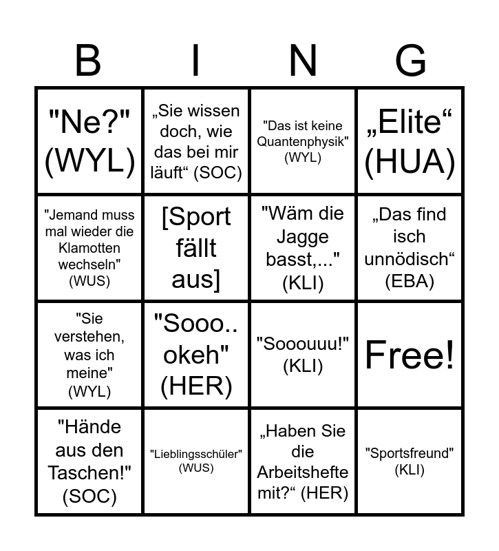 This bingo card has 20 words: Free!, "...bein dleddorn..." (KLI), "Das ist keine Quantenphysik" (WYL), [Ein Schüler ist eingeschlafen], "Hände aus den Taschen!" (SOC), "Jemand muss mal wieder die Klamotten wechseln" (WUS), "Lieblingsschüler" (WUS), "Ne?" (WYL), "Sie verstehen, was ich meine" (WYL), „Sie wissen doch, wie das bei mir läuft“ (SOC), "Sooo.. okeh" (HER), "Sooouuu!" (KLI), [Sport fällt aus], "Sportsfreund" (KLI), "Wäm die Jagge basst,..." (KLI), „...meine Frau...“ (KLI), „Das find isch unnödisch“ (EBA), „Elite“ (HUA), „Haben Sie die Arbeitshefte mit?“ (HER) and „In meine Heimat...“ (HUA).