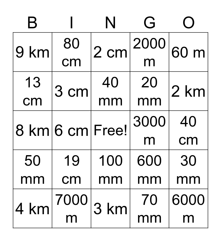 This bingo card has a free space and 28 words: 30 mm, 9 cm, 20 mm, 70 mm, 13 cm, 2 cm, 80 cm, 50 mm, 3000 m, 4 km, 8 km, 2000 m, 7000 m, 3 km, 2 km, 11000 m, 19 cm, 3 cm, 40 mm, 100 mm, 9 km, 8000 m, 6000 m, 6 cm, 40 cm, 600 mm, 60 m and 12000 m.