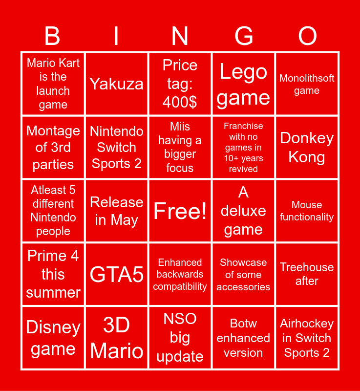 This bingo card has a free space and 30 words: 3D Mario, Mario Kart, Release in May, Prime 4, Mario Kart is the launch game, Price tag: 400$, Nintendo Switch Sports 2, Enhanced backwards compatibility, A deluxe game, NSO big update, Mouse functionality, Airhockey in Switch Sports 2, Botw enhanced version, Xbox game, Donkey Kong, C-Button, Showcase of some accessories, Prime 4 this summer, GTA5, Monolithsoft game, Atleast 5 different Nintendo people, Starts of with Logo animation, then trailer, Yakuza, Franchise with no games in 10+ years revived, Montage of 3rd parties, Lego game, Treehouse after, Disney game, Miis having a bigger focus and New IP.