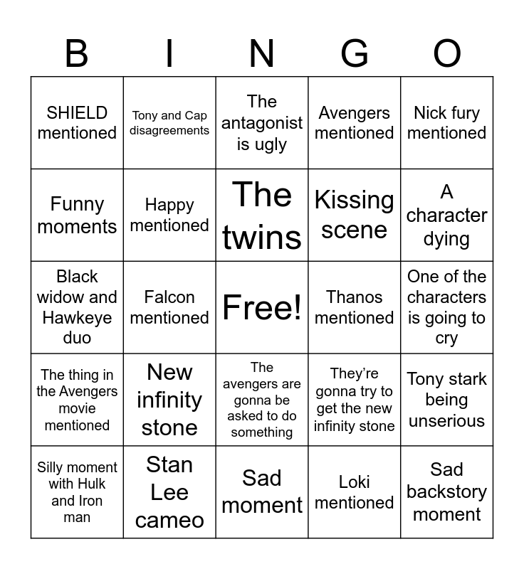 This bingo card has a free space and 24 words: New infinity stone, Stan Lee cameo, The twins, Silly moment with Hulk and Iron man, Nick fury mentioned, SHIELD mentioned, Funny moments, Tony and Cap disagreements, Thanos mentioned, The avengers are gonna be asked to do something, Kissing scene, Black widow and Hawkeye duo, They’re gonna try to get the new infinity stone, Tony stark being unserious, Happy mentioned, Loki mentioned, One of the characters is going to cry, The antagonist is ugly, A character dying, Falcon mentioned, Sad backstory moment, The thing in the Avengers movie mentioned, Avengers mentioned and Sad moment.