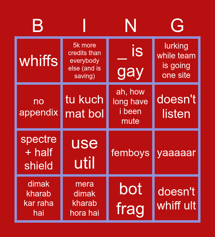 This bingo card has 16 words: mera dimak kharab hora hai, yaaaaar, _ is gay, whiffs, spectre + half shield, 5k more credits than everybody else (and is saving), femboys, bot frag, no appendix, tu kuch mat bol, dimak kharab kar raha hai, lurking while team is going one site, use util, doesn't listen, ah, how long have i been mute and doesn't whiff ult.