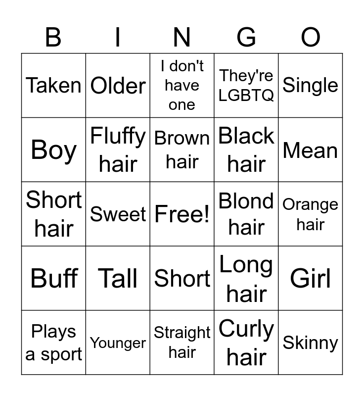 This bingo card has a free space and 24 words: Tall, Younger, Brown hair, Plays a sport, Single, Taken, Boy, Older, Blond hair, Short, Black hair, Short hair, Long hair, Girl, Fluffy hair, Curly hair, Orange hair, I don't have one, Mean, Sweet, Skinny, Buff, They're LGBTQ and Straight hair.