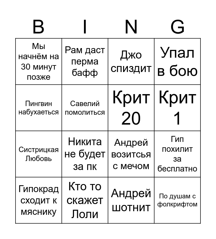 This bingo card has 16 words: Кто то скажет Лоли, Гип похилит за бесплатно, Джо спиздит, Мы начнём на 30 минут позже, Систрицкая Любовь, Рам даст перма бафф, Андрей возитсья с мечом, Андрей шотнит, Пингвин набухаеться, Савелий помолиться, Гипокрад сходит к мяснику, Упал в бою, Никита не будет за пк, Крит 1, Крит 20 and По душам с фолкрифтом.