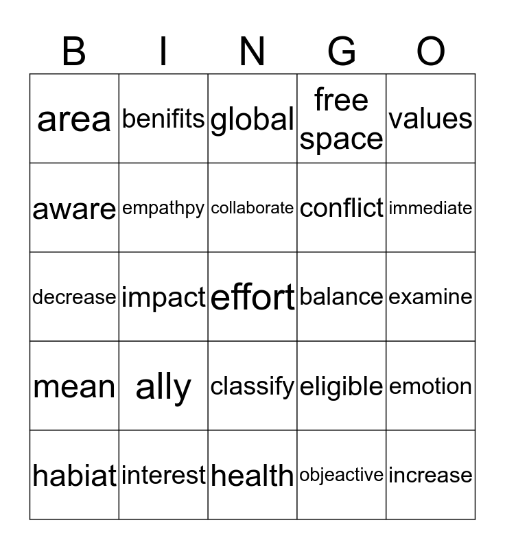 This bingo card has a free space and 25 words: ally, health, collaborate, habiat, values, area, aware, benifits, balance, classify, conflict, decrease, eligible, emotion, empathpy, energy, examine, global, immediate, impact, increase, interest, mean, free space and objeactive.