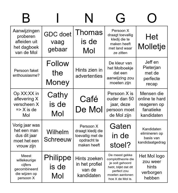 This bingo card has a free space and 24 words: Wilhelm Schreeuw, Philippe is de Mol, Hints zien in advertenties, Meest willekeurige cijfers gecombineerd die wijzen op persoon X, Het Molletje, Aanwijzingen proberen afleiden uit het dagboek van de Mol, Persoon faket enthousiasme?, GDC doet vaag gebaar, Persoon X is ouder dan 50 jaar, deze persoon moet de Mol zijn, Persoon X draagt kledij die toevallig met de opdracht te maken heeft, De kleur van het Molboekje dat een aanwijzing zou moeten zijn, Op XX:XX in aflevering X verscheen X => X is de Mol, Gaten in de stoel?, Kandidaten elimineren op basis van kandidaatgedrag, Follow the Money, De meest gekke complottheorie die je ooit gehoord hebt, blijkt dat dit perfect zou moeten aantonen hoe X de Mol is., Mensen die online te hard reageren op fanatieke kandidaten, Thomas is de Mol, Jeff en Pieterjan met de perfecte recap, Cathy is de Mol, Het Mol logo zou weer hints verborgen hebben, Vorig jaar was het een man dus dit jaar moet het een vrouw zijn, Persoon X draagt toevallig kledij die te maken heeft met land waar ze zitten and Hints zoeken in het profiel van de kandidaten.