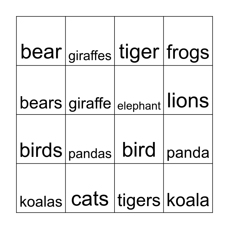 This bingo card has 24 words: monkey, monkeys, lions, lion, bears, bear, giraffe, giraffes, cats, cat, birds, bird, dogs, dog, elephant, elephants, tigers, tiger, pandas, panda, koalas, koala, frogs and frog.