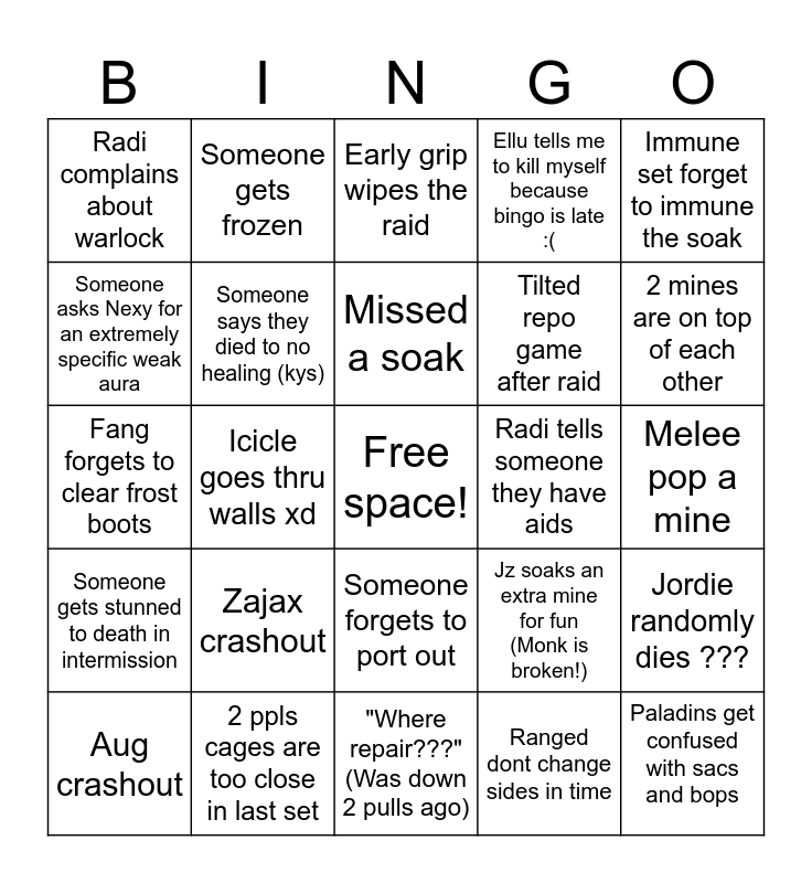 This bingo card has a free space and 24 words: Aug crashout, Zajax crashout, Missed a soak, Ranged dont change sides in time, Immune set forget to immune the soak, Radi complains about warlock, Someone gets frozen, Early grip wipes the raid, Radi tells someone they have aids, Melee pop a mine, Fang forgets to clear frost boots, Someone says they died to no healing (kys), Jz soaks an extra mine for fun (Monk is broken!), Jordie randomly dies ???, Someone asks Nexy for an extremely specific weak aura, 2 ppls cages are too close in last set, "Where repair???" (Was down 2 pulls ago), Ellu tells me to kill myself because bingo is late :(, 2 mines are on top of each other, Someone gets stunned to death in intermission, Icicle goes thru walls xd, Someone forgets to port out, Tilted repo game after raid and Paladins get confused with sacs and bops.