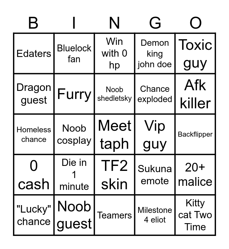 This bingo card has a free space and 33 words: Dead c00lkid, Afk survivalist, Noob shedletsky, Milestone 3 jason, Backflipper, Edaters, Furry, Teamers, Chance exploded, Kitty cat Two Time, Dragon guest, Bluelock fan, Milestone 4 eliot, Nobody died, Homeless chance, Noob cosplay, TF2 skin, Sukuna emote, 20+ malice, 0 cash, Noob guest, Betrayed 1x1x1x1, Demon king john doe, Afk killer, Friendly killer, Die in 1 minute, Win with 0 hp, Vip guy, Toxic guy, "Lucky" chance, C00lkid killed 007n7, Nyan Chance and Nyan Eliot.