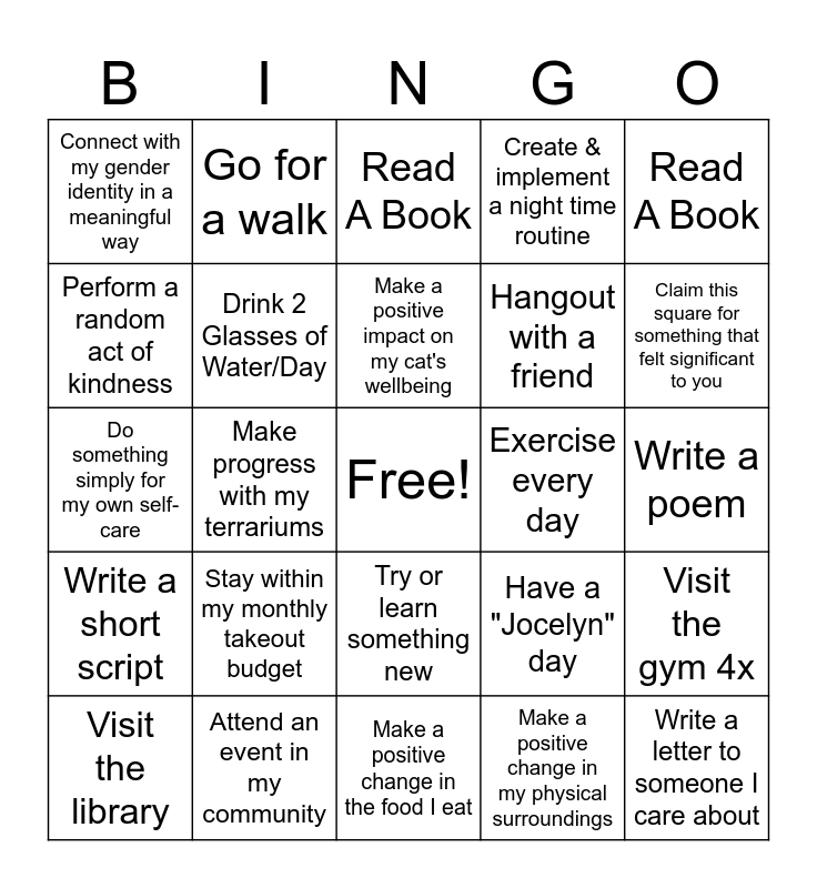 This bingo card has a free space and 24 words: Stay within my monthly takeout budget, Attend an event in my community, Make a positive impact on my cat's wellbeing, Visit the library, Read A Book, Connect with my gender identity in a meaningful way, Perform a random act of kindness, Go for a walk, Exercise every day, Try or learn something new, Hangout with a friend, Do something simply for my own self-care, Have a "Jocelyn" day, Visit the gym 4x, Drink 2 Glasses of Water/Day, Make a positive change in my physical surroundings, Write a poem, Read A Book, Claim this square for something that felt significant to you, Make progress with my terrariums, Write a letter to someone I care about, Write a short script, Create & implement a night time routine and Make a positive change in the food I eat.