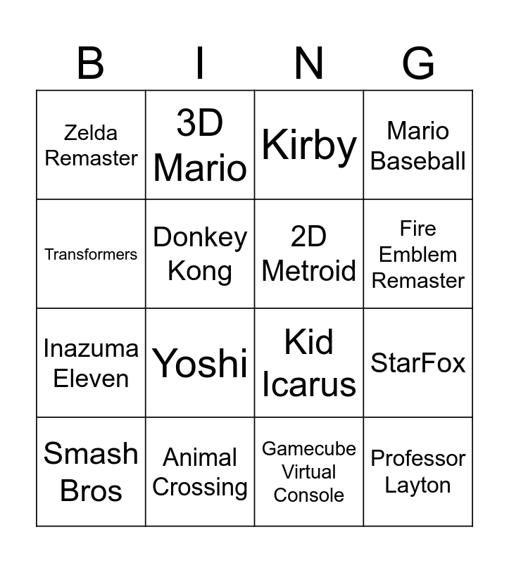 This bingo card has 16 words: Animal Crossing, StarFox, Kirby, Zelda Remaster, Inazuma Eleven, 3D Mario, Kid Icarus, Gamecube Virtual Console, Transformers, Donkey Kong, Smash Bros, Mario Baseball, Yoshi, Fire Emblem Remaster, 2D Metroid and Professor Layton.