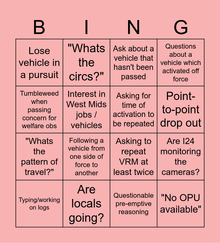 This bingo card has 16 words: Are locals going?, Are I24 monitoring the cameras?, Ask about a vehicle that hasn't been passed, Lose vehicle in a pursuit, "Whats the pattern of travel?", "Whats the circs?", Asking to repeat VRM at least twice, Questionable pre-emptive reasoning, Tumbleweed when passing concern for welfare obs, Interest in West Mids jobs / vehicles, Typing/working on logs, Questions about a vehicle which activated off force, Following a vehicle from one side of force to another, Point-to-point drop out, Asking for time of activation to be repeated and "No OPU available".