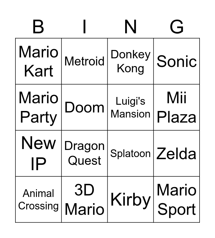 This bingo card has 16 words: 3D Mario, Zelda, Donkey Kong, Mario Kart, New IP, Metroid, Splatoon, Kirby, Mario Party, Doom, Animal Crossing, Sonic, Dragon Quest, Mii Plaza, Luigi's Mansion and Mario Sport.