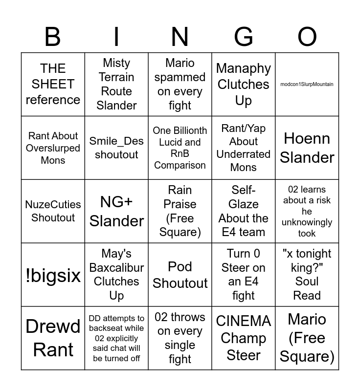 This bingo card has a free space and 45 words: 02 forgets am important piece of prep (moveset, item, predmg, etc.), Mario (Free Square), 02 throws on more than half the fights, Drewd Rant, 1/768 fiction on Jasmine, CINEMA Champ Steer, Mario spammed on every fight, Whitney Rant, modcon1SlurpMountain, DD attempts to backseat while 02 explicitly said chat will be turned off, Manaphy Clutches Up, Self-Glaze About the E4 team, Pod Shoutout, May's Baxcalibur Clutches Up, 02 yaps about something completely irrelevant to the E4/game, 02 throws on every single fight, Amikam Family Shoutout, NuzeCuties Shoutout, Aboboat Shoutout, Hoenn Slander, Misty Terrain Route Slander, Mints Rant, Randomly starts speaking French, THE SHEET reference, WAIT, 02 learns about a risk he unknowingly took, 02 misclicks on a fight, 02 misclicks on more than one fight, Turn 0 Steer on an E4 fight, !bigsix, 02 sings the !bigsix jingle, "x tonight king?" Soul Read, RitzMitz spam, Multiple instances of forced "HOES x", Dekzeh Slander, NG+ Slander, 02 wipes, Rants about Old Guard Lucid Frogs, ONEMICKPATCH Rant/Slander, One Billionth Lucid and RnB Comparison, Rant About Overslurped Mons, Rant/Yap About Underrated Mons, modconnor Shoutout, Smile_Des shoutout and Sisyphus Reference.