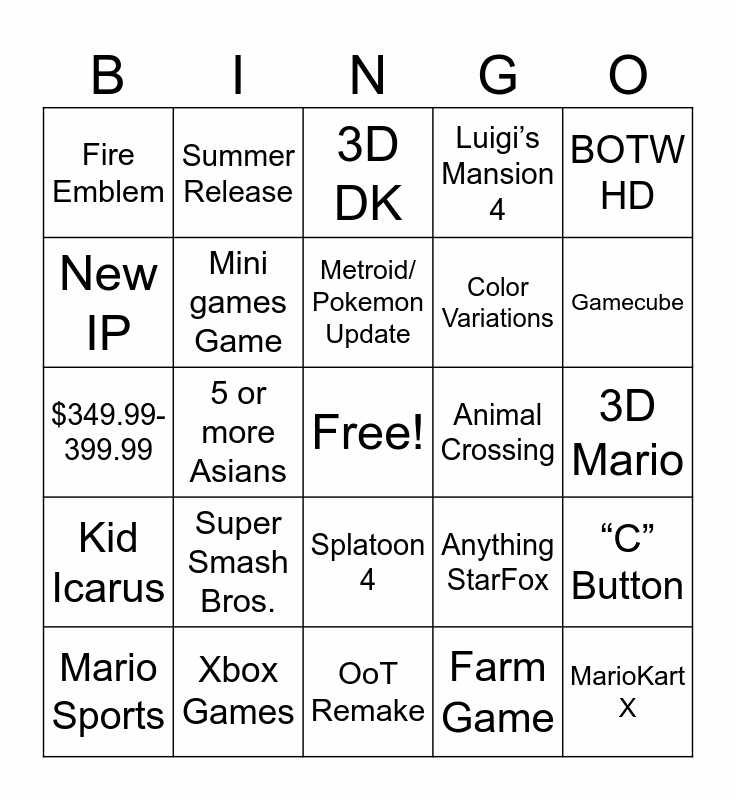 This bingo card has a free space and 24 words: Super Smash Bros., Xbox Games, Metroid/ Pokemon Update, Mario Sports, BOTW HD, Fire Emblem, New IP, Summer Release, Animal Crossing, Splatoon 4, Color Variations, $349.99-399.99, Anything StarFox, “C” Button, Mini games Game, Farm Game, 3D Mario, 3D DK, Gamecube, 5 or more Asians, MarioKart X, Kid Icarus, Luigi’s Mansion 4 and OoT Remake.