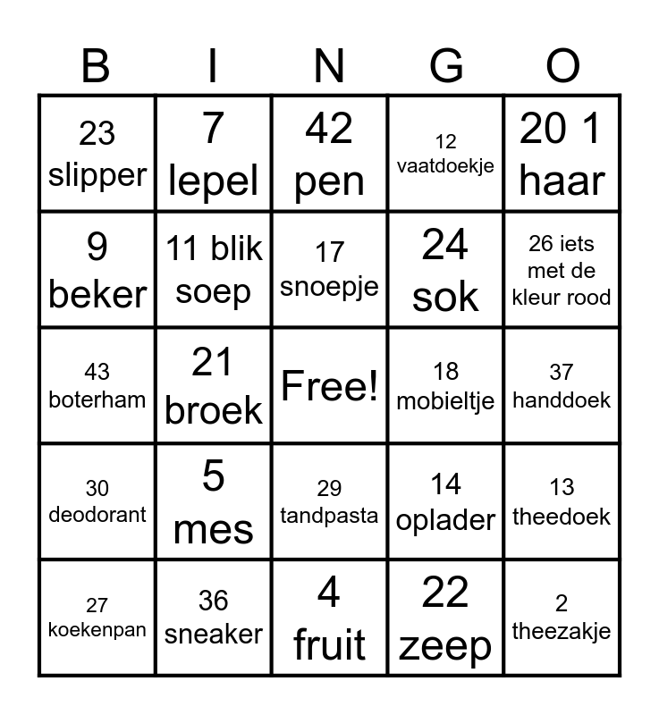 This bingo card has a free space and 46 words: 1 slaapzak, 2 theezakje, 3 hoofdkussen, 4 fruit, 5 mes, 6 vork, 7 lepel, 8 bord, 9 beker, 10 voetbal, 11 blik soep, 12 vaatdoekje, 13 theedoek, 14 oplader, 15 ei, 16 grassprietje, 17 snoepje, 18 mobieltje, 19 tas, 20 1 haar, 21 broek, 22 zeep, 23 slipper, 24 sok, 25 trui, 26 iets met de kleur rood, 27 koekenpan, 28 tandenborstel, 29 tandpasta, 30 deodorant, 31 haargel, 32 haarborstel, 33 iets met de kleur geel, 34 iets met de kleur groen, 35 iets met de kleur blauw, 36 sneaker, 37 handdoek, 38 schone onderbroek, 39 jas, 40 wc-papier, 41 snijplank, 42 pen, 43 boterham, 44 boterhamzakje, 45 sleutel and 46 pakje drinken.