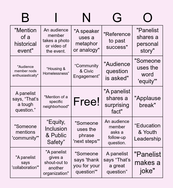 This bingo card has a free space and 38 words: “Financial Aid & College Affordability”, “Mental Health & Stress Management”, “Economic Growth & Career Development”, “Housing & Homelessness”, “Education & Youth Leadership, “Equity, Inclusion & Public Safety”, “Community & Civic Engagement”, “Long-Term Vision & Future Growth”, "Panelist shares a personal story", "Audience question is asked", "Mention of a specific neighborhood", "Reference to past success", "Panelist makes a joke", "Applause break", "Audience member nods enthusiastically", "Someone mentions 'community'", "A panelist says 'change starts with us'", "A speaker uses a metaphor or analogy", "Someone says 'Florence County'", "A panelist shares a surprising fact", "Mention of a historical event", "A panelist gives a shout-out to another organization", "Someone uses the word 'equity'", "A panelist says 'collaboration'", "A question is repeated for clarity", "Someone says 'thank you for your question'", "A panelist adjusts their microphone", "A speaker references a local business", "Someone says 'moving forward'", "A panelist makes eye contact with the audience", "The moderator smiles or laughs", "Someone uses the phrase 'next steps'", A panelist says “That’s a great question”, An audience member takes a photo or video of the event., A panelist encourages students to contact their local representatives., An audience member asks a follow-up question., A panelist says, “That’s a tough question.” and A panelists “piggybacks” off of another.