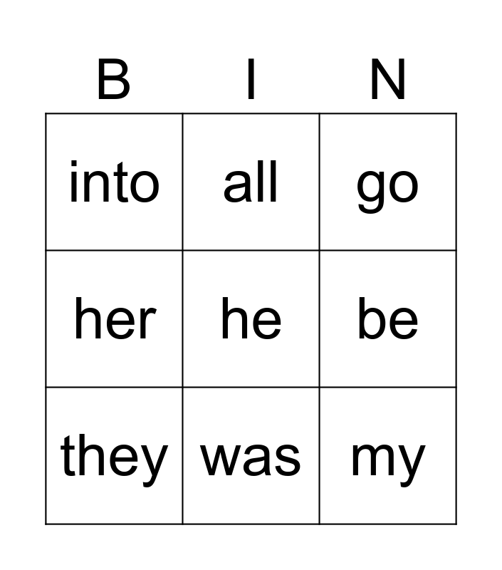 This bingo card has 15 words: I, the, go, into, was, he, she, me, be, my, you, her, they, all and are.