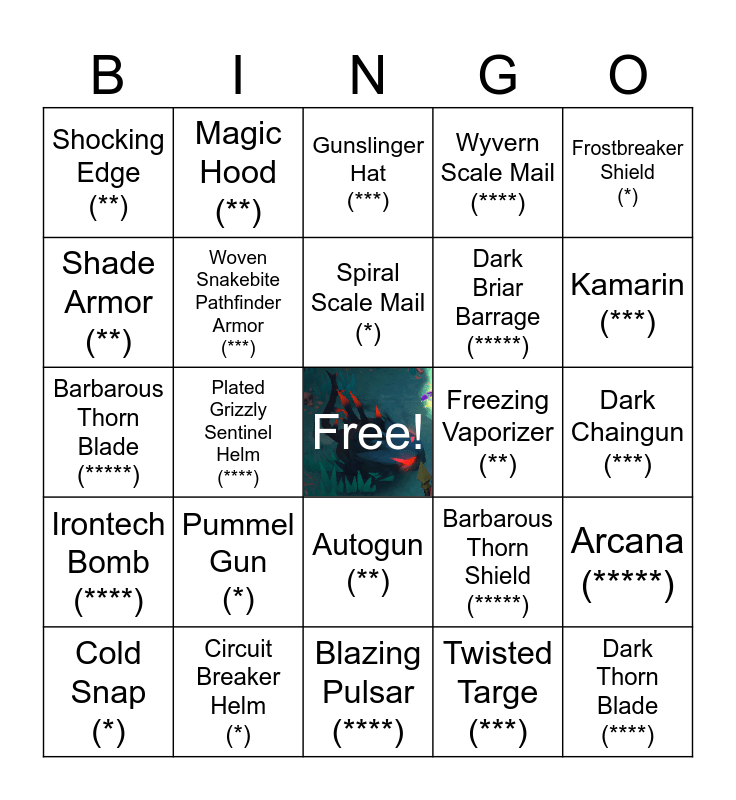 This bingo card has a free space and 24 words: Pummel Gun (*), Circuit Breaker Helm (*), Spiral Scale Mail (*), Cold Snap (*), Frostbreaker Shield (*), Shocking Edge (**), Shade Armor (**), Magic Hood (**), Freezing Vaporizer (**), Autogun (**), Dark Briar Barrage (*****), Barbarous Thorn Blade (*****), Barbarous Thorn Shield (*****), Arcana (*****), Woven Snakebite Pathfinder Armor (***), Twisted Targe (***), Dark Chaingun (***), Gunslinger Hat (***), Kamarin (***), Plated Grizzly Sentinel Helm (****), Dark Thorn Blade (****), Irontech Bomb (****), Wyvern Scale Mail (****) and Blazing Pulsar (****).
