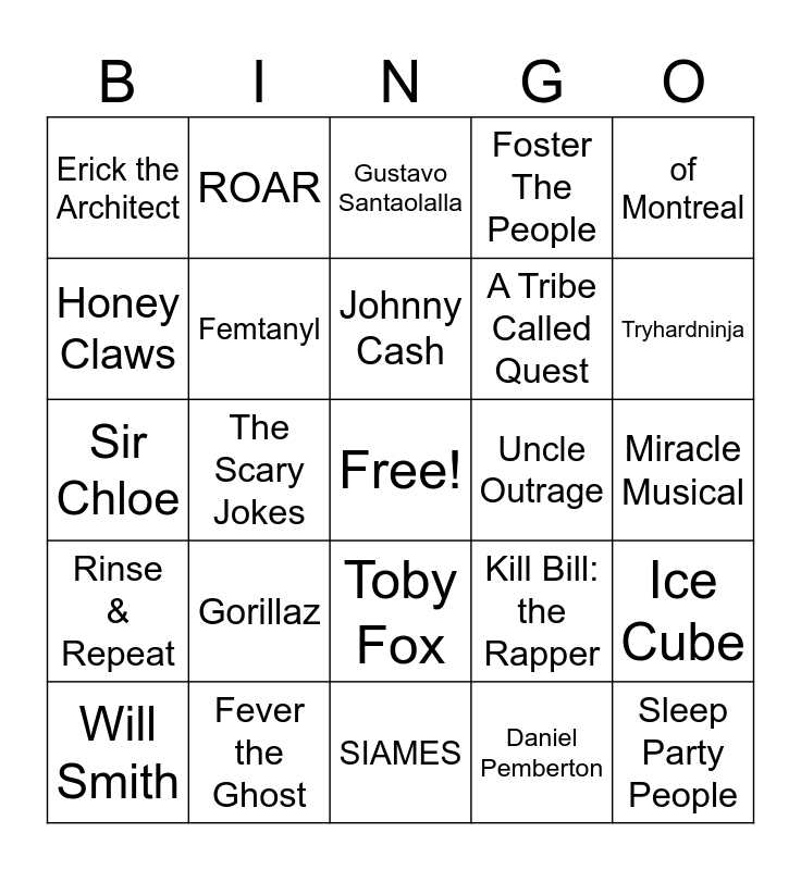 This bingo card has a free space and 24 words: Gorillaz, Fever the Ghost, Johnny Cash, Will Smith, of Montreal, Erick the Architect, Honey Claws, ROAR, Uncle Outrage, Toby Fox, A Tribe Called Quest, Sir Chloe, Kill Bill: the Rapper, Ice Cube, Femtanyl, Daniel Pemberton, Miracle Musical, Gustavo Santaolalla, Tryhardninja, The Scary Jokes, Sleep Party People, Rinse & Repeat, Foster The People and SIAMES.