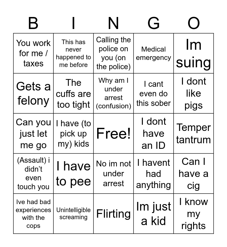 This bingo card has a free space and 29 words: Ive had bad experiences with the cops, I have work, I have (to pick up my) kids, Theres real criminals out there, You work for me / taxes, Calling the police on you (on the police), The cuffs are too tight, I have to pee, I dont have an ID, Unintelligible screaming, Temper tantrum, I know my rights, Flirting, Im just a kid, I dont like pigs, You’re racist, No im not under arrest, (Assault) i didn’t even touch you, Im suing, Can you just let me go, I havent had anything, Thinks theyre killing the sobriety test (they’re not), I cant even do this sober, Gets a felony, Medical emergency, This has never happened to me before, Can I have a cig, Why am I under arrest (confusion) and Why are there so many of you.