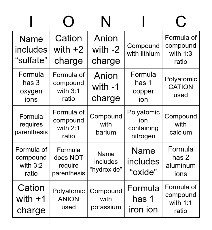 This bingo card has 33 words: Formula of compound with 1:1 ratio, Formula of compound with 1:2 ratio, Formula of compound with 2:1 ratio, Formula of compound with 2:3 ratio, Formula of compound with 3:2 ratio, Formula of compound with 3:1 ratio, Formula of compound with 1:3 ratio, Cation with +1 charge, Cation with +2 charge, Cation with +3 charge, Anion with -1 charge, Anion with -2 charge, Anion with -3 charge, Name requires roman numerals, Polyatomic ion containing nitrogen, Polyatomic CATION used, Polyatomic ANION used, Formula requires parenthesis, Formula does NOT require parenthesis, Name includes “oxide”, Name includes “hydroxide”, Name includes “sulfide”, Name includes “sulfate”, Compound with calcium, Compound with potassium, Compound with barium, Compound with lithium, Formula has 1 copper ion, Formula has 3 oxygen ions, Formula has 2 aluminum ions, Formula has 2 potassium ions, Formula has 1 iron ion and Formula has 1 nitrogen ion.