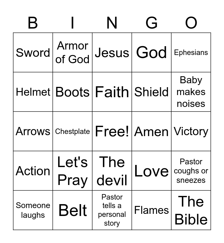 This bingo card has a free space and 24 words: Let's Pray, Belt, Faith, Someone laughs, Ephesians, Sword, Helmet, Armor of God, Amen, The devil, Shield, Arrows, Love, Pastor coughs or sneezes, Boots, Flames, Victory, Jesus, Baby makes noises, Chestplate, The Bible, Action, God and Pastor tells a personal story.