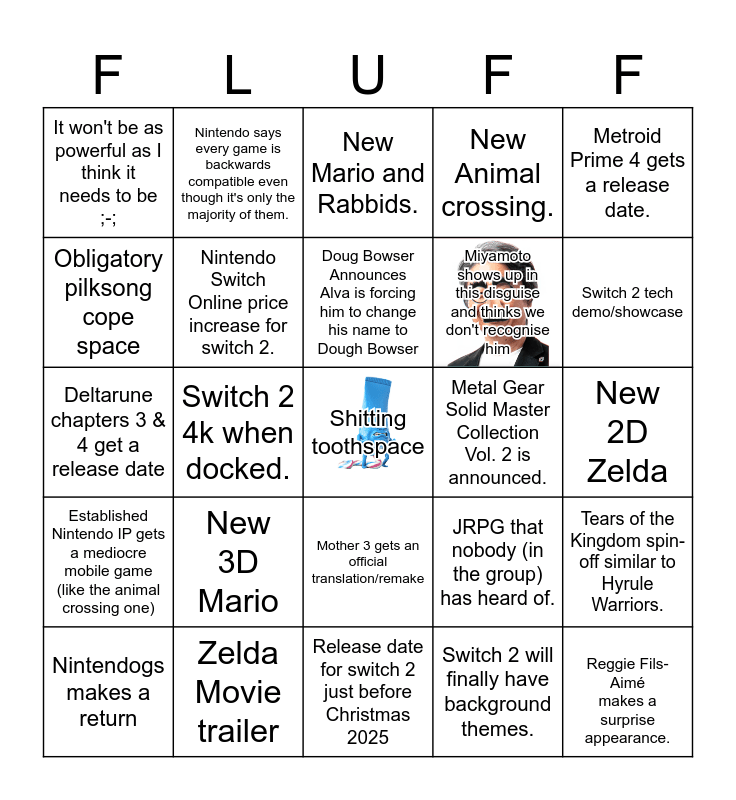 This bingo card has 1 images, a free space and 24 words: New 3D Mario, Zelda Movie trailer, Doug Bowser Announces Alva is forcing him to change his name to Dough Bowser, Nintendogs makes a return, Metroid Prime 4 gets a release date., It won't be as powerful as I think it needs to be ;-;, Obligatory pilksong cope space, Nintendo says every game is backwards compatible even though it's only the majority of them., Metal Gear Solid Master Collection Vol. 2 is announced., Mother 3 gets an official translation/remake, Miyamoto shows up in this disguise and thinks we don't recognise him, Deltarune chapters 3 & 4 get a release date, JRPG that nobody (in the group) has heard of., Tears of the Kingdom spin-off similar to Hyrule Warriors., Nintendo Switch Online price increase for switch 2., Switch 2 will finally have background themes., New 2D Zelda, New Mario and Rabbids., Switch 2 tech demo/showcase, Switch 2 4k when docked., Reggie Fils-Aimé makes a surprise appearance., Established Nintendo IP gets a mediocre mobile game (like the animal crossing one), New Animal crossing. and Release date for switch 2 just before Christmas 2025.