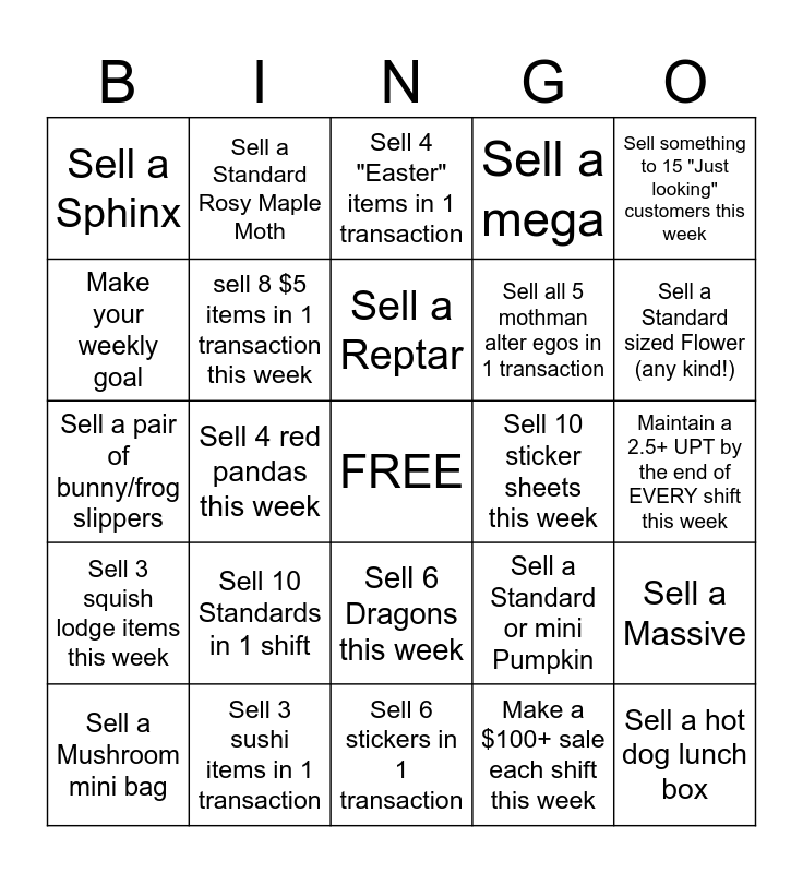 This bingo card has a free space and 24 words: Sell 10 Standards in 1 shift, Sell 3 sushi items in 1 transaction, Sell a Reptar, Sell a Mushroom mini bag, Sell something to 15 "Just looking" customers this week, Sell a Sphinx, Make your weekly goal, Sell a Standard Rosy Maple Moth, Sell 10 sticker sheets this week, Sell 6 Dragons this week, Sell all 5 mothman alter egos in 1 transaction, Sell a pair of bunny/frog slippers, Sell a Standard or mini Pumpkin, Sell a Massive, sell 8 $5 items in 1 transaction this week, Make a $100+ sale each shift this week, Maintain a 2.5+ UPT by the end of EVERY shift this week, Sell 4 "Easter" items in 1 transaction, Sell a Standard sized Flower (any kind!), Sell 4 red pandas this week, Sell a hot dog lunch box, Sell 3 squish lodge items this week, Sell a mega and Sell 6 stickers in 1 transaction.