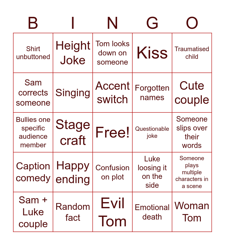 This bingo card has a free space and 49 words: Luke Womanning, Woman Tom, Woman AJ, Evil Tom, Happy ending, Bald Joke, Height Joke, 4th wall break, Sam corrects someone, Child, Singing, Kiss, Someone plays multiple characters in a scene, Luke loosing it on the side, Character break, Monologue, Accent switch, Questionable joke, Someone plays an animal, Traumatised child, Stage craft, Emotional death, Shirt unbuttoned, Forgotten names, Sam laugh on stage, Cute couple, Sam + Luke couple, Tom Judges grammar, Confusion on plot, Caption comedy, Unnamed amazing character, Someone cant understand Sam's accent, Creepy Character, Someone typing in chat, Random fact, Someone gets flipped off, Buff J, Dodgy accent, Someone slips over their words, Amazing Villain, AJ pretends to have hair, Luke is a child, Sexy woman, Involves audience, Bullies one specific audience member, Tom looks down on someone, Someone is on their knees, Running Joke/ Making fun for a mistake and 1 Loved character by the audience.
