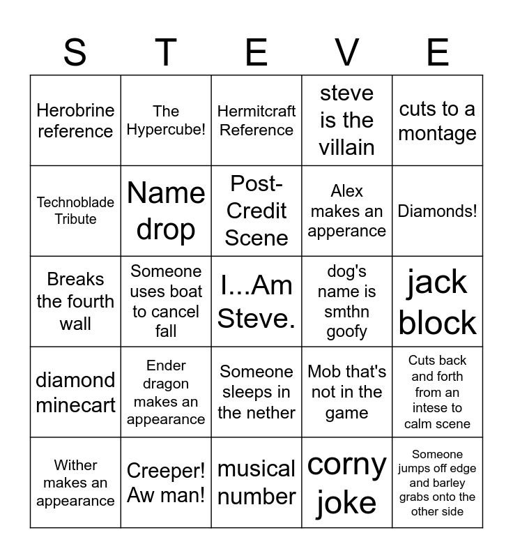 This bingo card has a free space and 24 words: Ender dragon makes an appearance, Creeper! Aw man!, Post-Credit Scene, Wither makes an appearance, cuts to a montage, Herobrine reference, Technoblade Tribute, The Hypercube!, dog's name is smthn goofy, Someone sleeps in the nether, Alex makes an apperance, Breaks the fourth wall, Mob that's not in the game, Cuts back and forth from an intese to calm scene, Name drop, corny joke, jack block, Hermitcraft Reference, Diamonds!, Someone uses boat to cancel fall, Someone jumps off edge and barley grabs onto the other side, diamond minecart, steve is the villain and musical number.